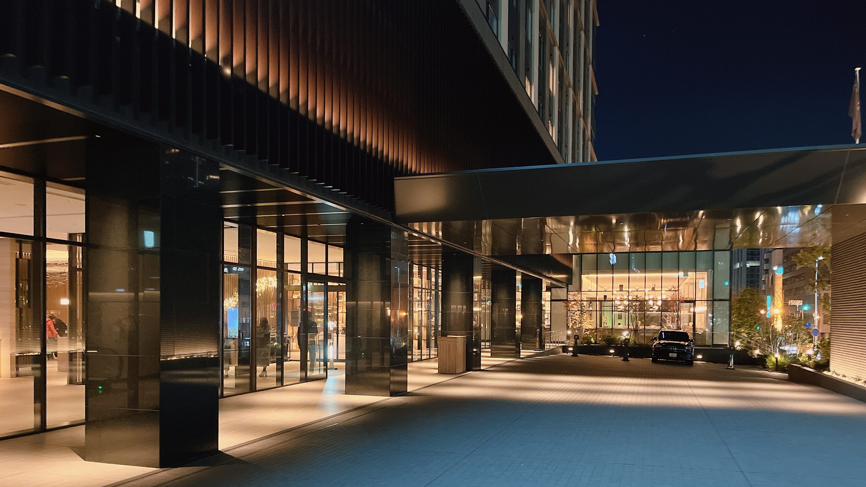 駐車場は正面エントランスとは反対側になりますので、まずは正面で大きな荷物を降ろして車を駐車場側に持っていくのがラクです。コートヤード・バイ・マリオットホテルは中規模、中価格のビジネス向けホテルという位置付けですが、外観もロビーも豪華です。